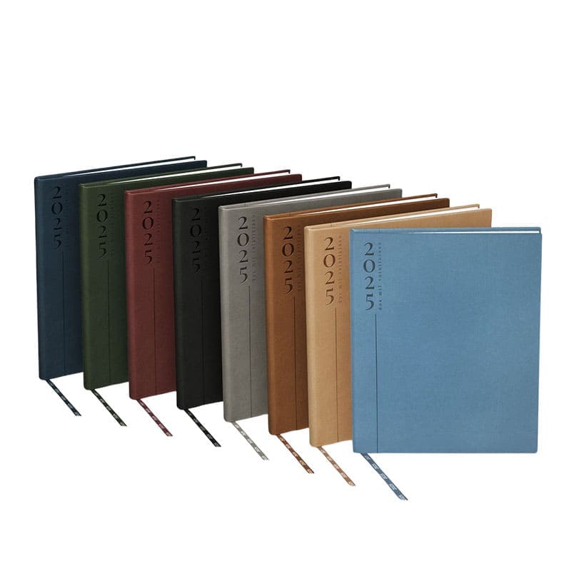 Agenda semanal con 80 hojas. Contiene datos personales, calendarios 2024-2025-2026, planeador 2025, presupuesto de gastos, seguimiento de nuevos hábitos, organizador de tareas, planeador de proyecto y días festivos. Incluye caja individual.