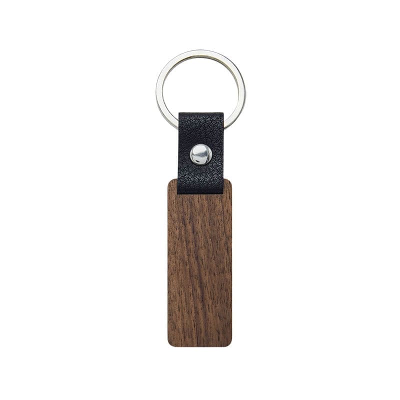 Llavero de madera con tira de curpiel. Incluye empaque con exhibidor de cartón y bolsa individual.